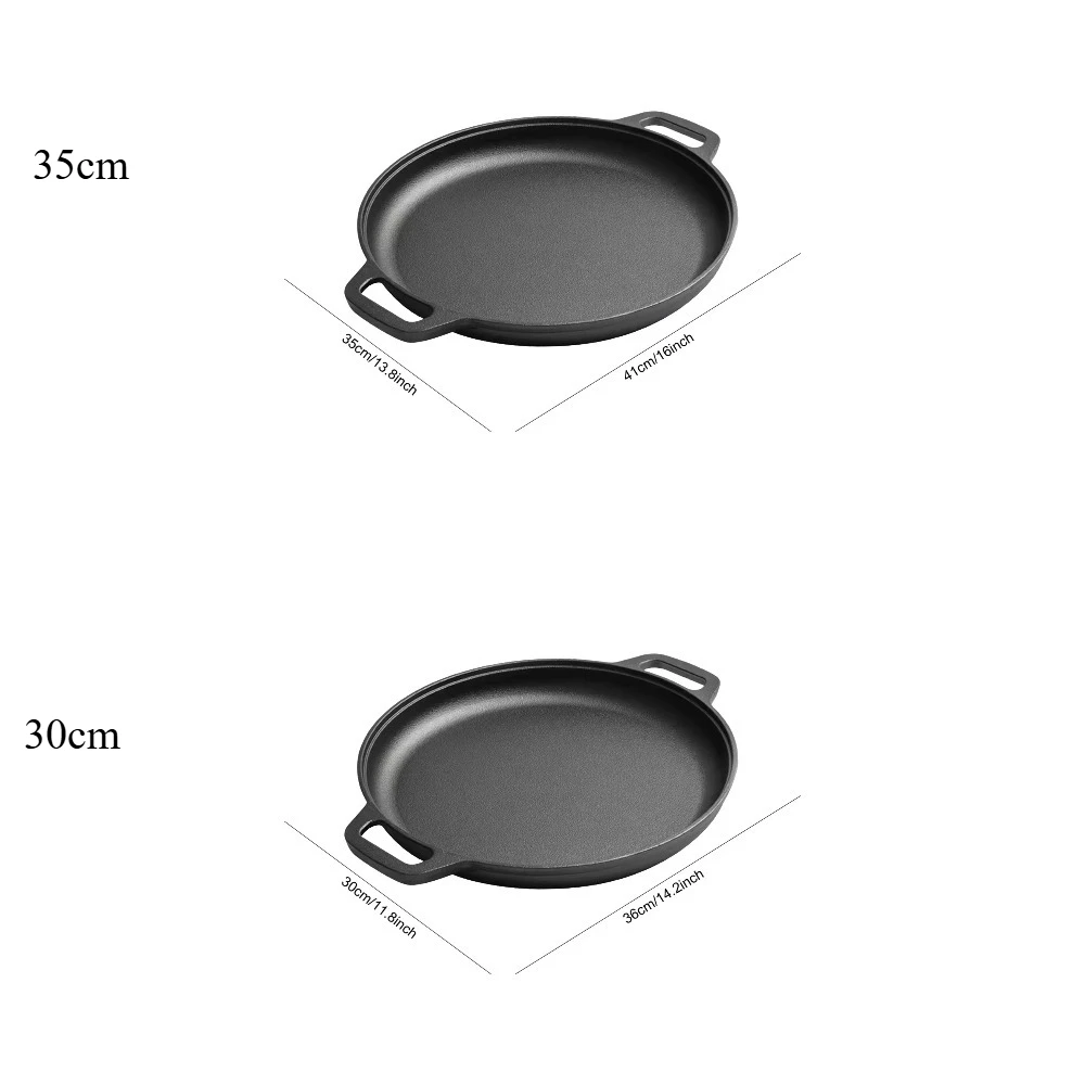 Versatile cast iron round frying pan with double handles. Perfect for camping, grilling, pizza, and pancakes. Durable 35cm design for kitchen and outdoor cooking.