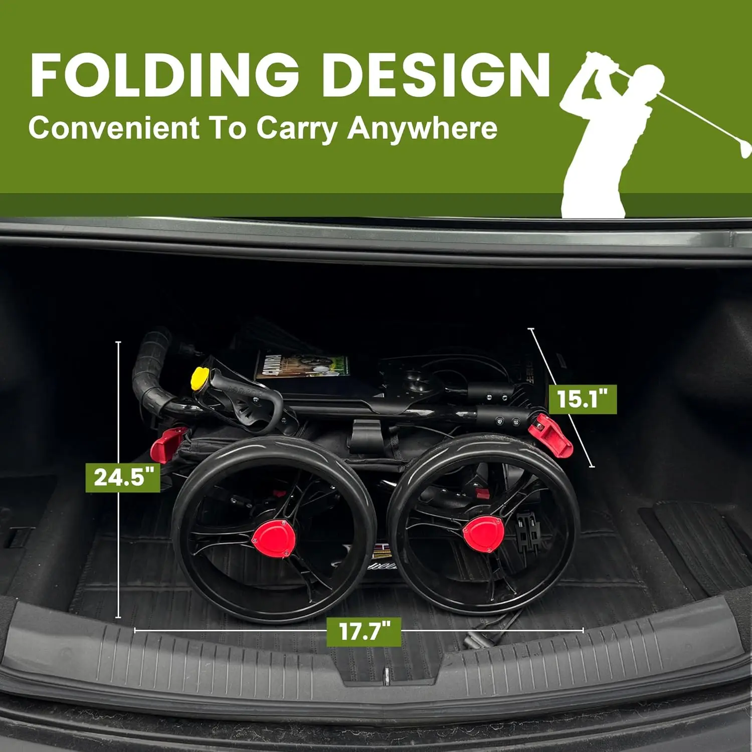 - 1-Click Folding: 4-wheel golf push cart wth one simple click, this folding golf cart collapses to a compact 24.5" x 17.7" x 15", making it easy to store in car trunks, lockers, or small spaces.