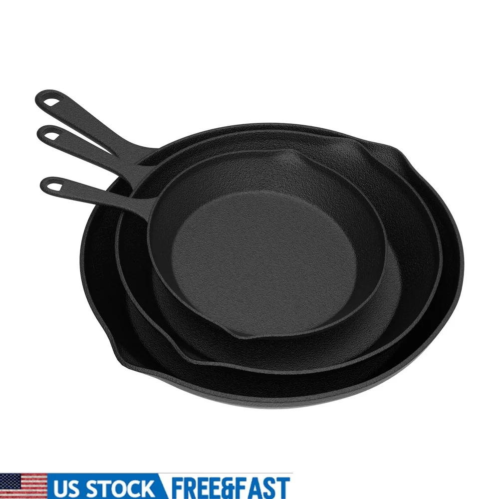 With a 10”, an 8”, and a 6” pan included in this versatile 3-piece frying pan set, you will be able to cook a variety of foods, from pizza to eggs, bacon, cornbread, biscuits, pancakes, crepes, fajitas, burgers and more. Constructed from cast iron, and pre-seasoned to prevent foods from sticking, these pans are sturdy cookware that you will be able to use for many years to come! NOTE: Do not put pans in the dishwasher. To clean, simply rinse with hot water (do not use soap) and wipe with a sponge (do not use steel wool sponges). If there are stuck-on food remnants, scrub with coarse salt until clean. You can also boil some water in pan to loosen up the particals. Dry thoroughly and rub with oil.