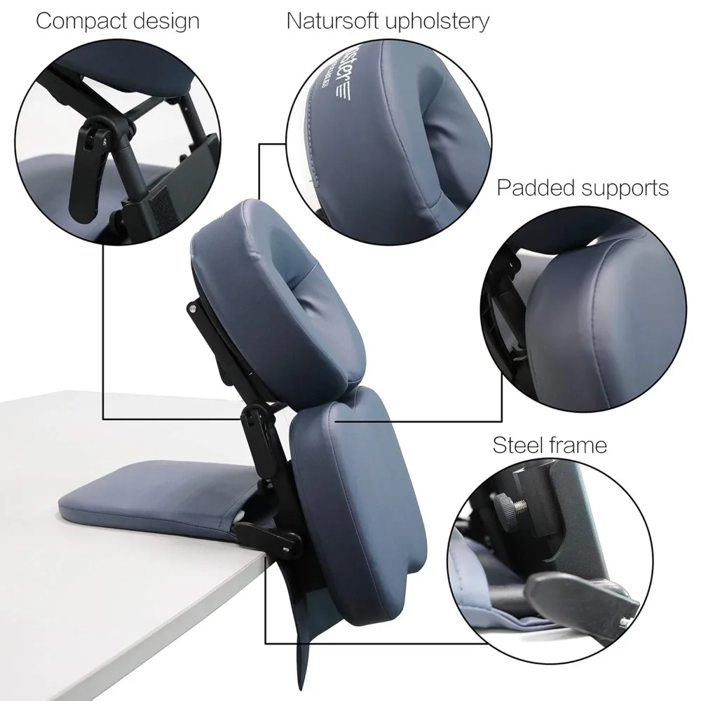 Portable desktop face cradle for massage therapy. Foldable, adjustable head rest cushion fits any table or desk. Perfect for home and office massage and relaxation.