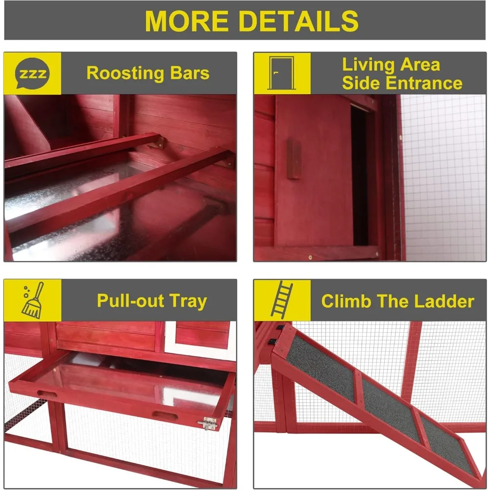 This chicken coop is designed to provide ample space for your chickens to move around, spread their wings, and forage, contributing to their overall well-being. The spacious dimensions of 71.3 inches in length, 26.14 inches in width, and 39.4 inches in height can comfortably accommodate 1-4 chickens. Constructed from durable cedar wood with eco-friendly paint and featuring a sloping roof made of asphalt, gravel, and wooden boards, the coop is waterproof and ensures that the interior remains dry and cozy. It includes a ramp for easy access and a nesting box for egg-laying. The coop is equipped with a removable tray for convenient cleaning and galvanized wire fencing that protects the chickens from predators while allowing for proper ventilation. Assembly is straightforward, with clear instructions provided. Should any parts be missing or damaged, our customer service is ready to assist with replacements or discounts as needed.