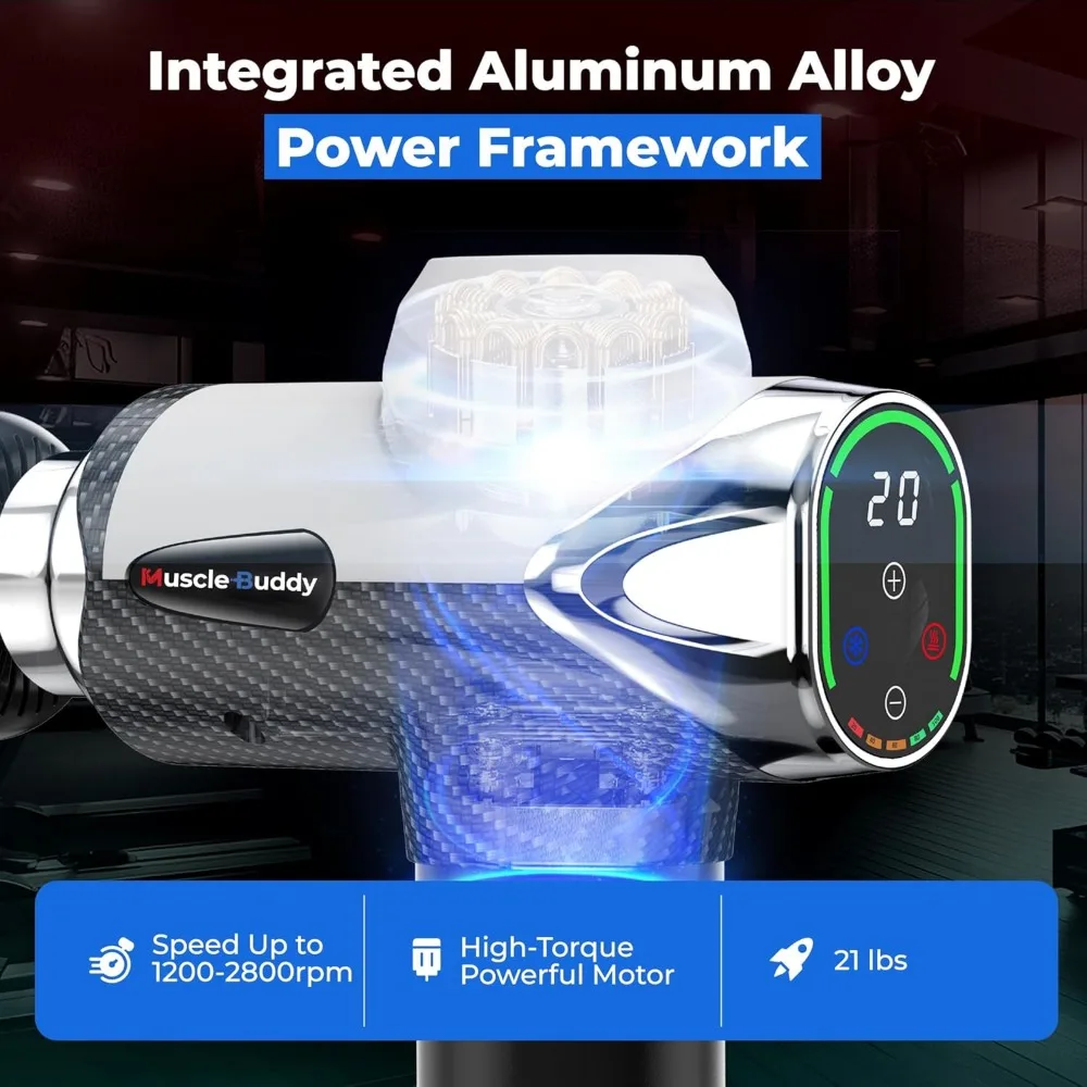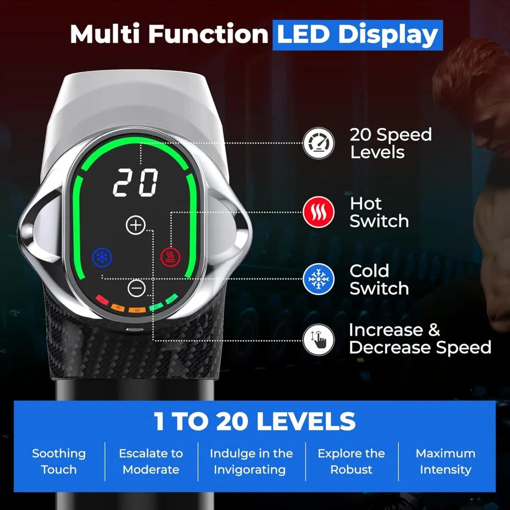 Professional percussion massage gun with hot and cold therapy heads. Portable handheld muscle massager with carrying case. Deep tissue relief for recovery.