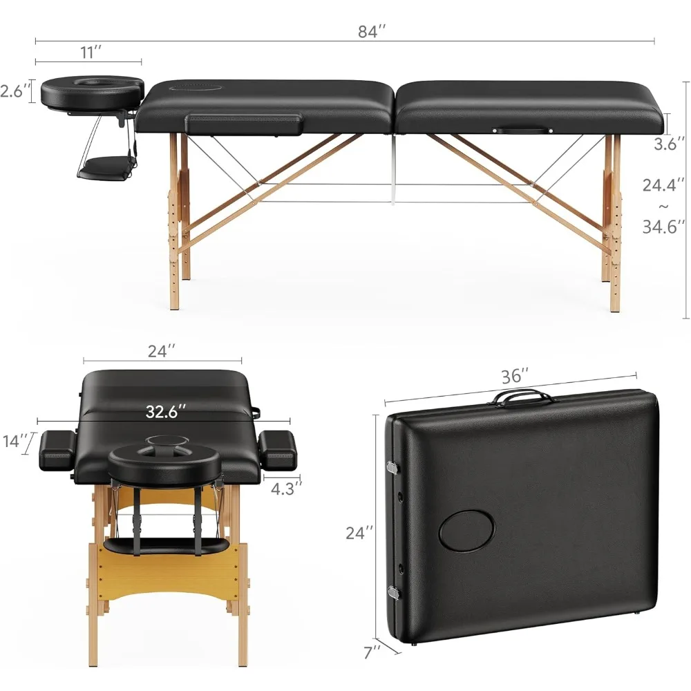 Professional 2-fold portable massage table with adjustable height. 24" wide wooden lash bed perfect for spa, tattoo, and wellness treatments. Foldable design for easy transport and storage.