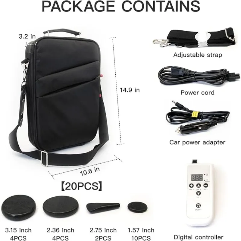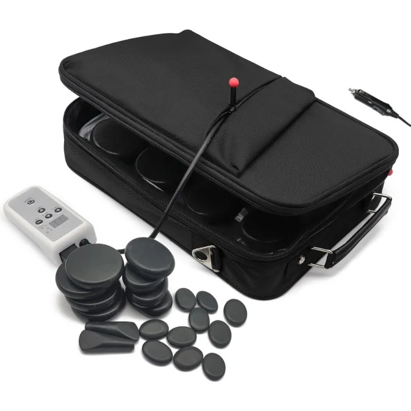 Professional 20-piece basalt hot stone massage set with electric heater. Portable stone warmer kit for spa therapy, muscle relaxation, and pain relief at home.